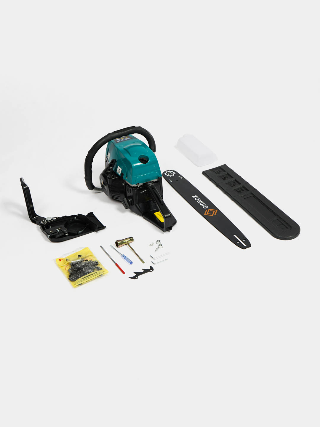 Двигатель в сборе, шина 18″ 45см, цепь 1 штуки, (шаг 0,325, ширина паза 1/3, количество звеньев 72), защитный чехол для шины, емкость для топлива, набор инструментов для сборки, паспорт (инструкция по эксплуатации).